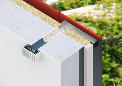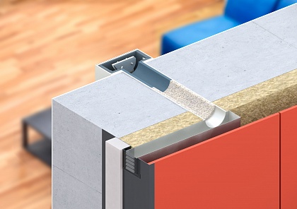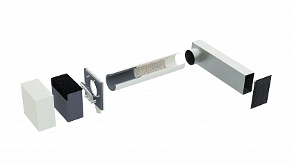 Воздуховод диаметром 90 мм проходит через отверстие в стене, далее, в воздушном зазоре навесного фасада соединяется с коленом, которое переходит в воздуховод прямоугольного сечения с выходом в откос. Со стороны откоса воздуховод «прячется» под декоративной металлической решеткой (покрашена под цвет откоса). Клапан не заметен с фасада здания.