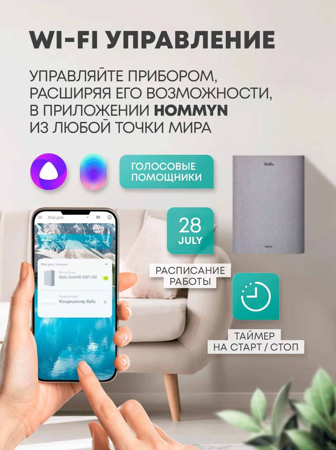 Управлять прибором можно сенсорными кнопками на приборе и через мобильное приложение HOMMYN по Wi-Fi. Прибор работает с голосовыми помощниками Алисой и Марусей. Приложение HOMMYN позволяет управлять прибором как в локальной сети, так и дистанционно и расширяет возможности прибора. С его помощью вы сможете настраивать расписание и режимы работы устройства по дням и даже часам.